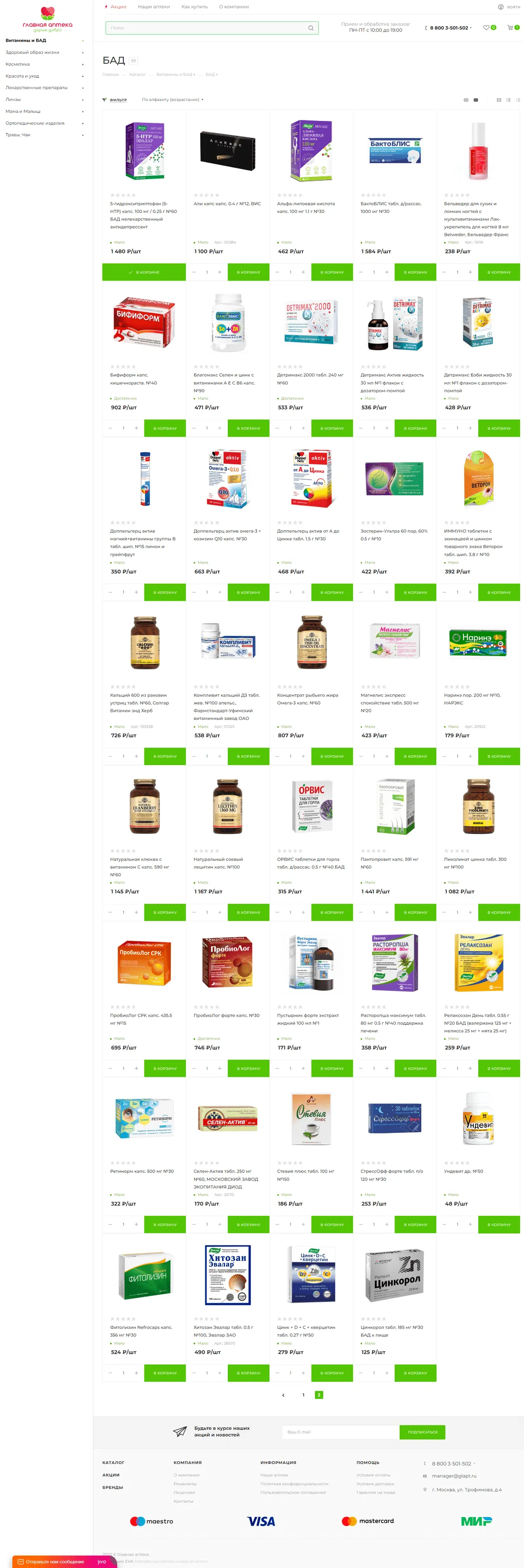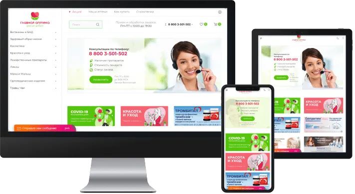 У компании раньше не было своего сайта, поэтому продажа велась только через стационарную аптечную сеть. Заказчик принял решение расширить географию продаж и аудиторию клиентов, создать представительство аптеки в сети интернет. В наши задачи входило создать сайт, наполнить каталог товарами из 1С и тщательно проработать оформление, соединить склады аптек с онлайн складами.